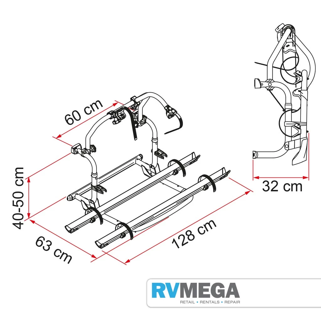 Compact, rear mounted bike rack for coach-built motorhomes with limited installation space on the back wall. The Carry Bike Pro C carries 2 bikes as standard but can be made to hold 3 or 4 bikes with optional upgrade kits.