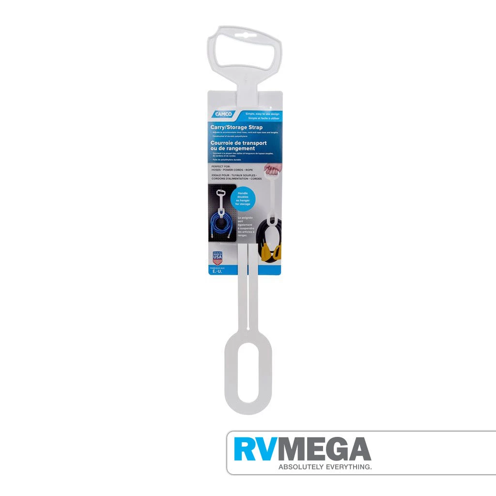 The Camco Hose and Cord Carry Strap is a simple, easy to use way to hang, organize and store cords, hoses and ropes. The carry strap will adjust to accommodate most hose, cord and rope sizes and lengths, and the handle doubles as a hanger for easy storage. An integrated slit on the carry strap can be used to hold and keep track of the ends on your rope or extension cord so that they don’t get lost in the coil. The durable polyethylene hanger makes a great addition to any garage or shed. White.