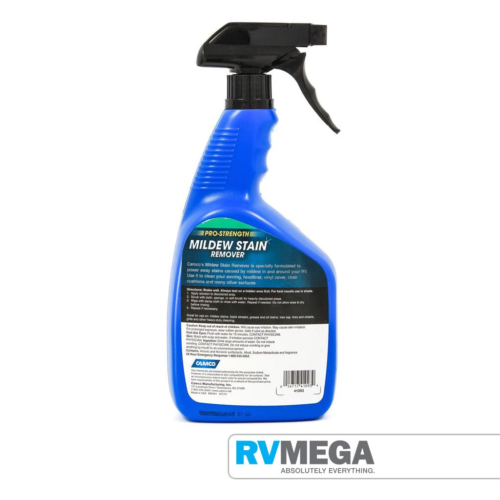 The Camco Pro-Strength Mildew Stain Remover safely cleans mildew stains, black streaks, tree sap, tires and wheels and even grills. It is specially formulated to power away stains caused by mildew in and around your RV. Use it to clean your awning, headliner, vinyl cover, chair cushions and many other surfaces. Breathe new life into your RV and help restore a like-new appearance.