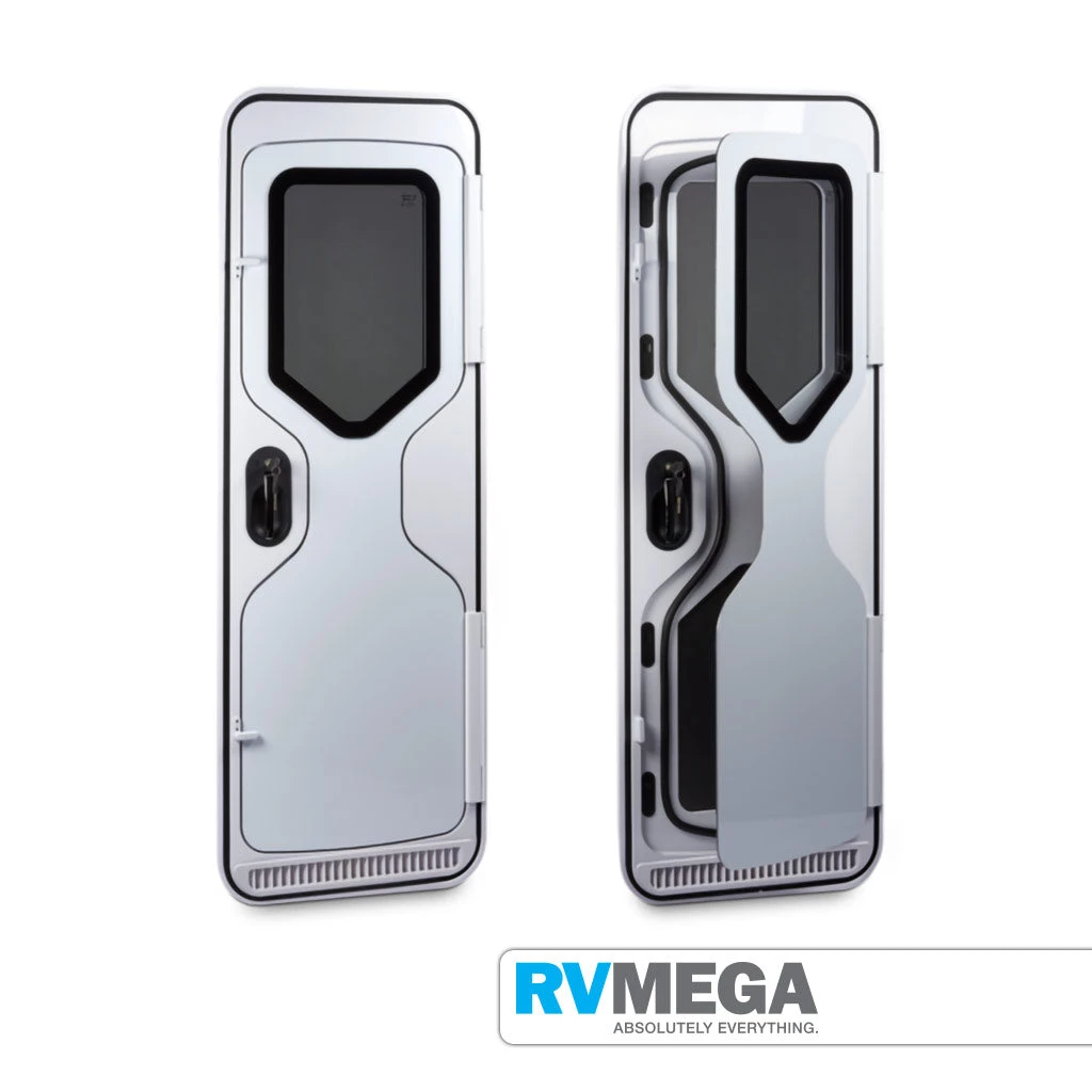 The Dometic CaraD door is a white sandwich door panel for RVs with an aluminium frame and an integrated high security safety mesh screen, including blind and four point locking system.