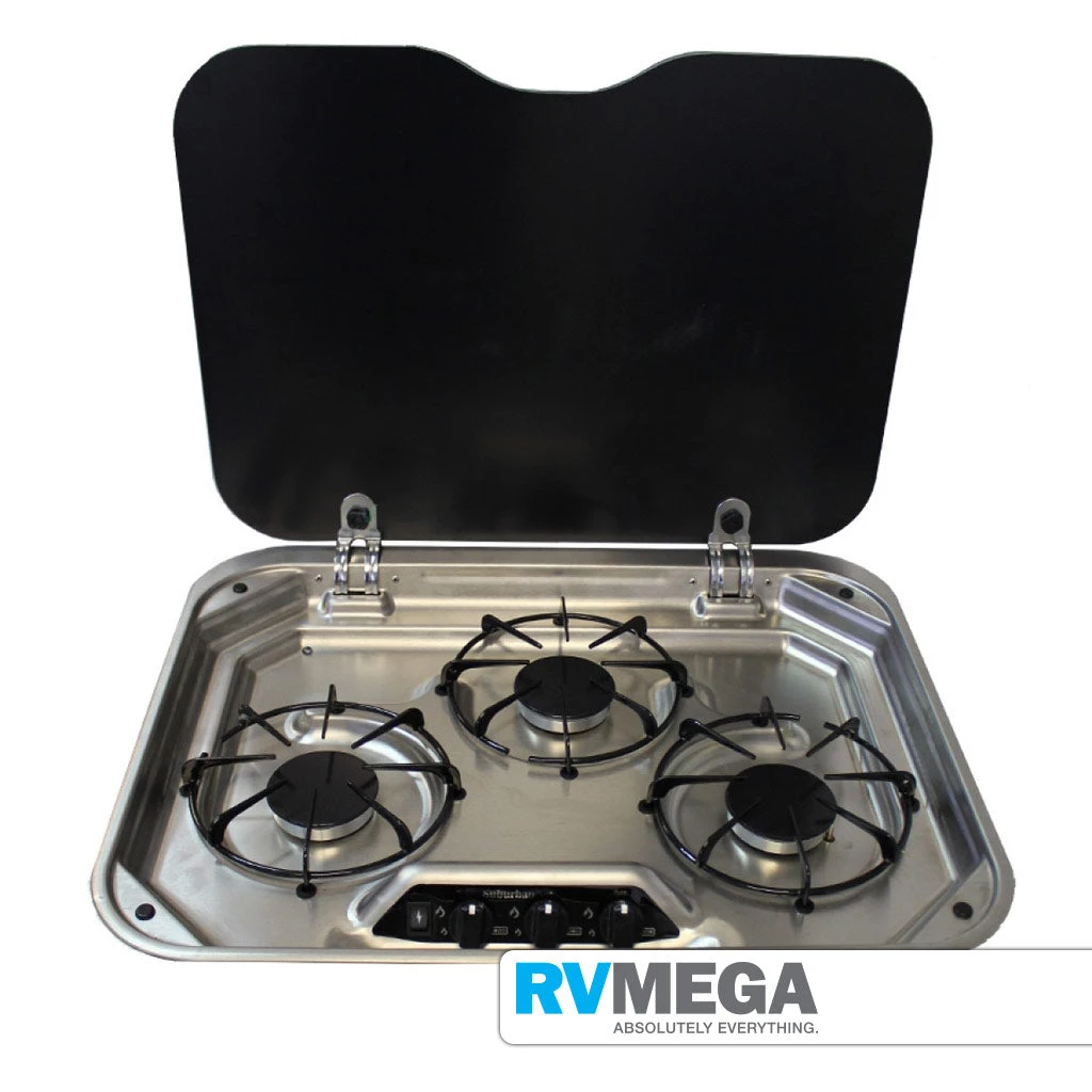 Drop-in three-burner Suburban RV Cooktops add compact, high-efficiency cooking performance to any motorhome, travel trailer, van or larger camper. Cooktops meet most manufacturer and installer size requirements, and are available with optional covers and side wind guards.