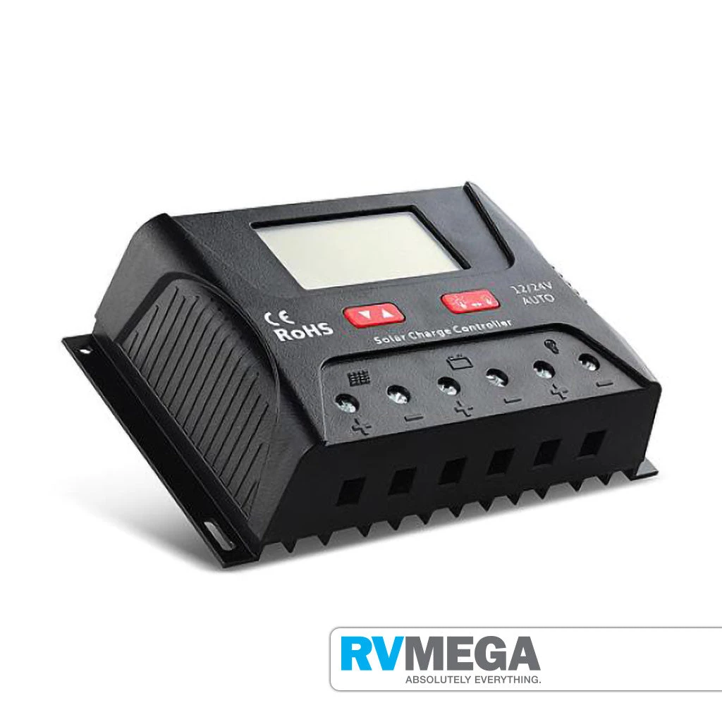 Large LCD display informs user about all operating modes with the aid of symbols. The state of charge is represented visually in the form of a tank display. Data such as voltage, current and state of charge can also be displayed digitally as figures on the display. In addition, the controller has an energy meter which can be reset by the user. These have automatic battery voltage detection, and adjustable voltage setting for Lithium.