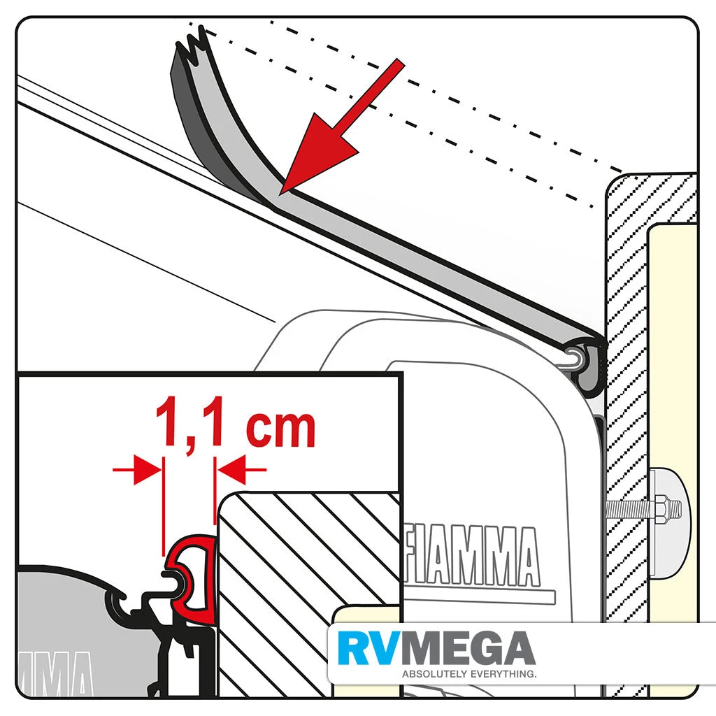No additional sealant or adhesives are required and it can be installed without removing the Fiamma awning. Fiamma Rain Guard S fits to the hooked lip on the top of the awning case. It is pressed against the motorhome wall.