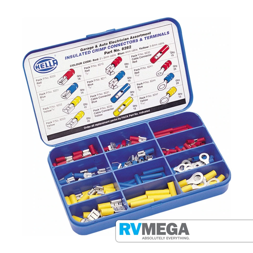 Assortment containing 12 types of HELLA insulated double crimp terminals / connectors specifically designed to meet the requirements of the automotive industry.
