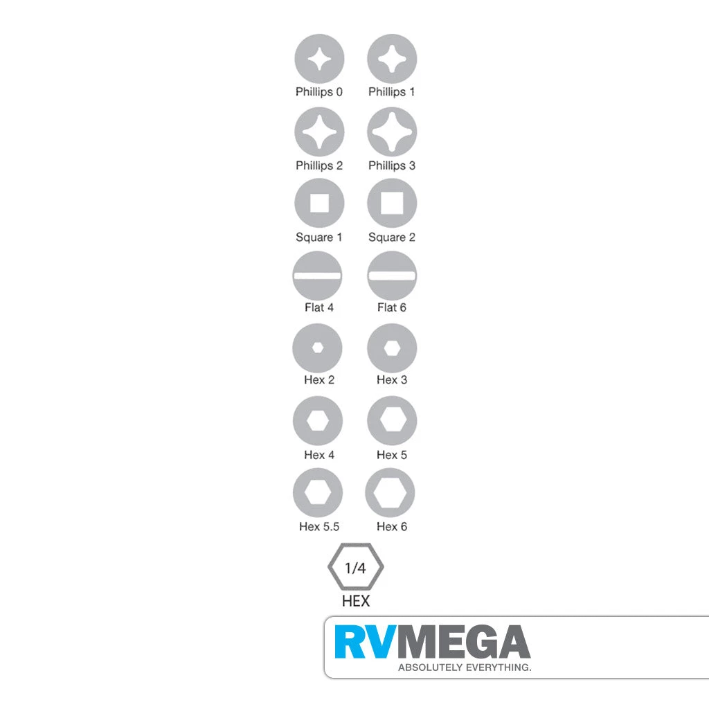 Dedicated marine screwdriver bits -loaded with 7 double end professional quality bits, this assortment of bit types and sizes provides the 14 most popular tips for driving screws in a marine setting. The shaft opening serves as a 1/4″ hex driver.
