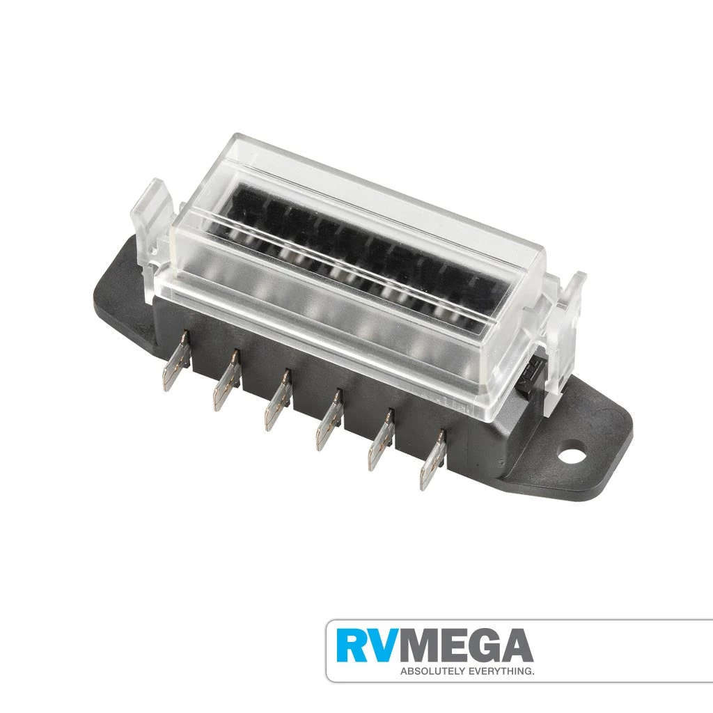 6-Way Standard Blade Fuse Box with Transparent Cover, Gasket and 12 Terminals.