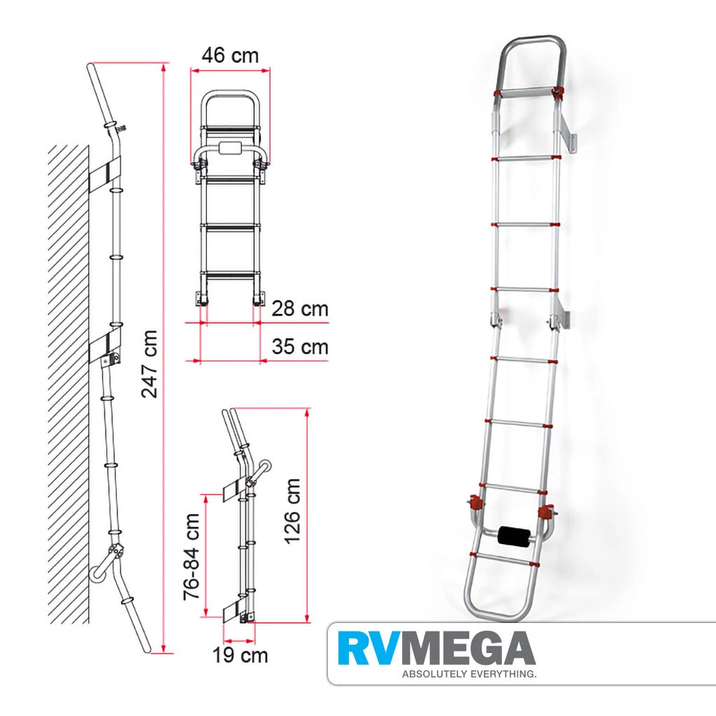 External ladder – Sturdy light weight exterior ladder with 8 steps. It can be folded up and locked when not in use or while travelling.