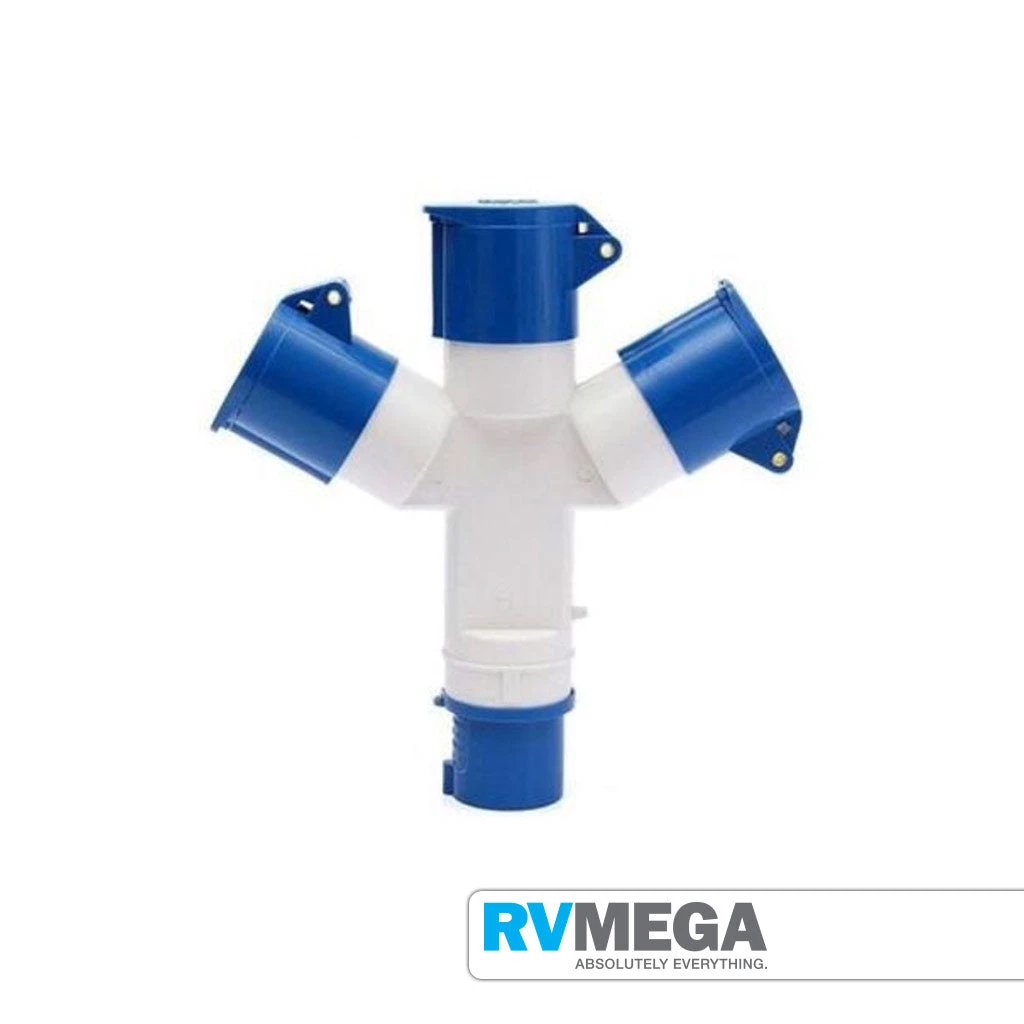 3 Way Mains Splitter Adapter 16A – Connect 3 hook up cables to one socket. Ideal for caravan and camping sites when using multiple electric accessories.
