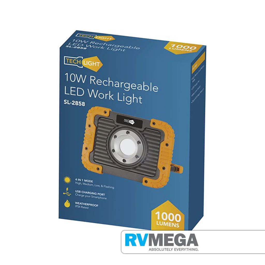 With a rubberised protective surround, this 1000 lumens LED work light is a rugged addition to your work equipment. Itβs rechargeable for around a 3-hour run time of each charge, and there are four light modes which include high, medium, low and flashing. It also provides a USB charging port so it can be used as a battery bank too! Thereβs a charge level indicator to keep an eye on remaining charge, and it includes a versatile stand with adjustable angle too. Includes a USB charging cable.