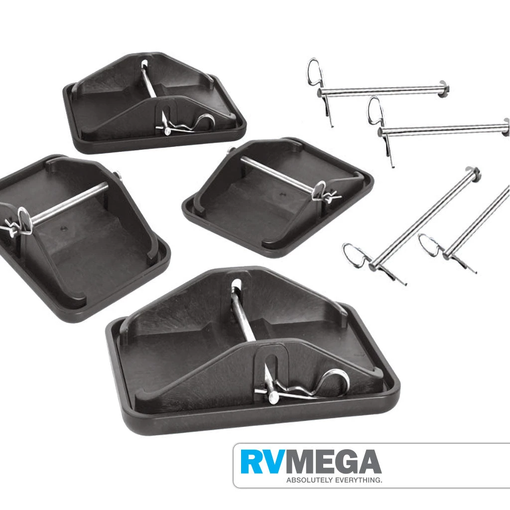 Jumbo Carafeet stabilising feet feature an extra large footprint area to prevent the corner steady legs sinking on soft ground or gravel. Simply attach to your caravan corner steady legs to keep your caravan stable on-site.