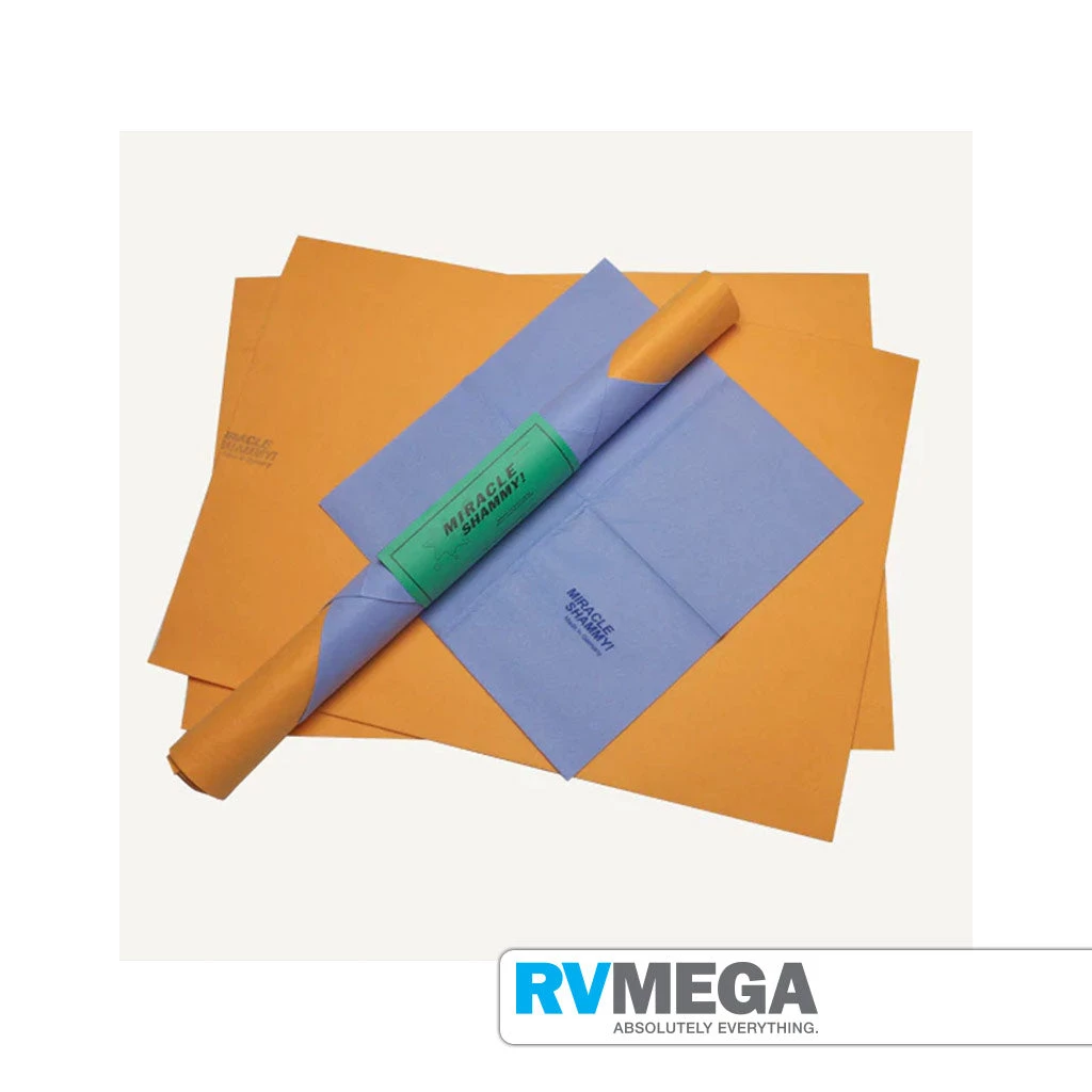 Synthetic, man-made chamois, cleans and polishes, streak-free. Twice the size of a leather chamois, one-quarter the price and the leather chamois doesn’t have half the uses.