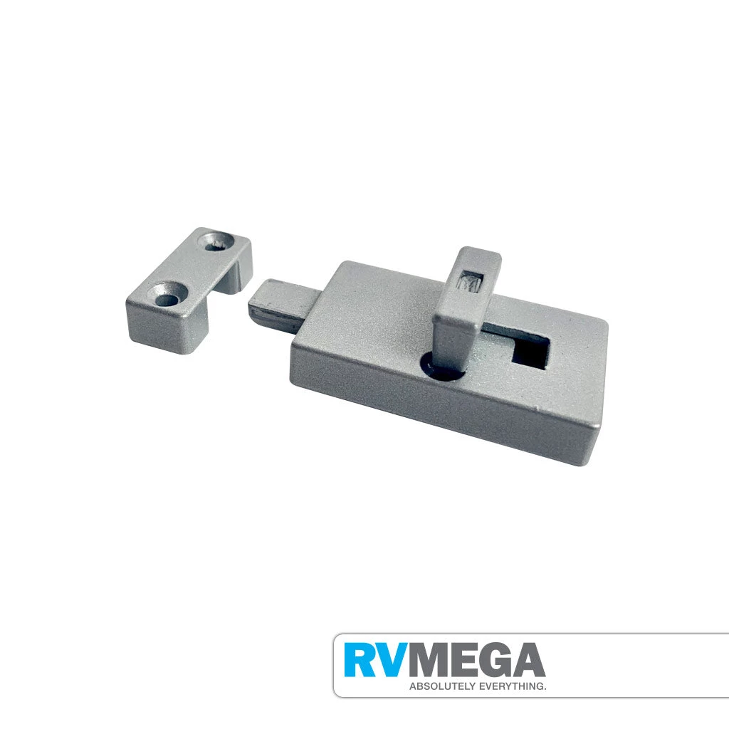 A solid cast, aluminium stable door bolt assembly, used in many older caravans.