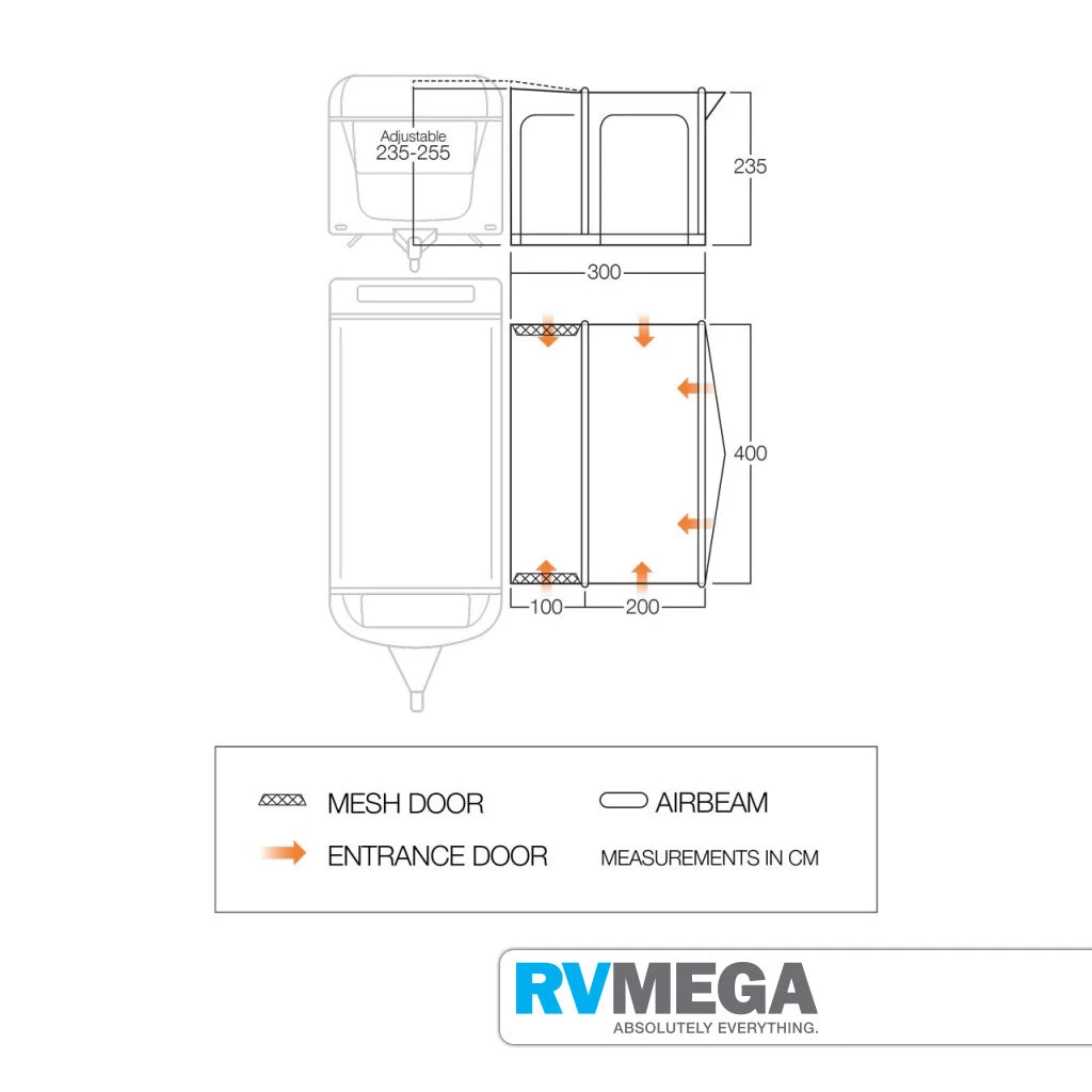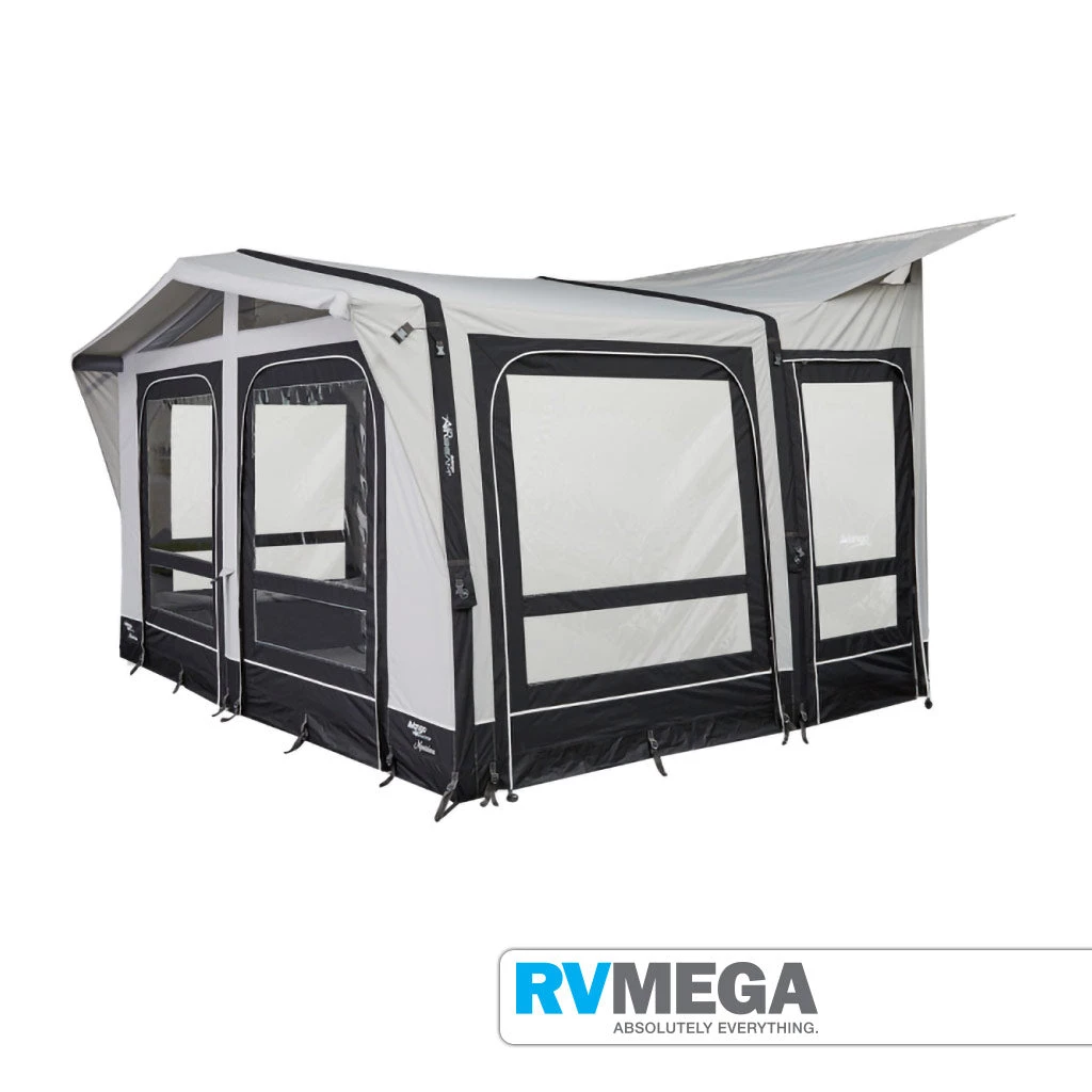 Designed in a traditional style, the Vango Montelena air awning pitches in a matter of minutes, making it ideal for touring caravanners. The bright and airy space allows plenty of room for furniture to help you sit back and relax on your holidays. The two front doors can be removed completely for the addition of mesh panels for added ventilation on hot days. Whilst the large side doors can be removed for the optional annex, perfect for added storage or when family come to stay.