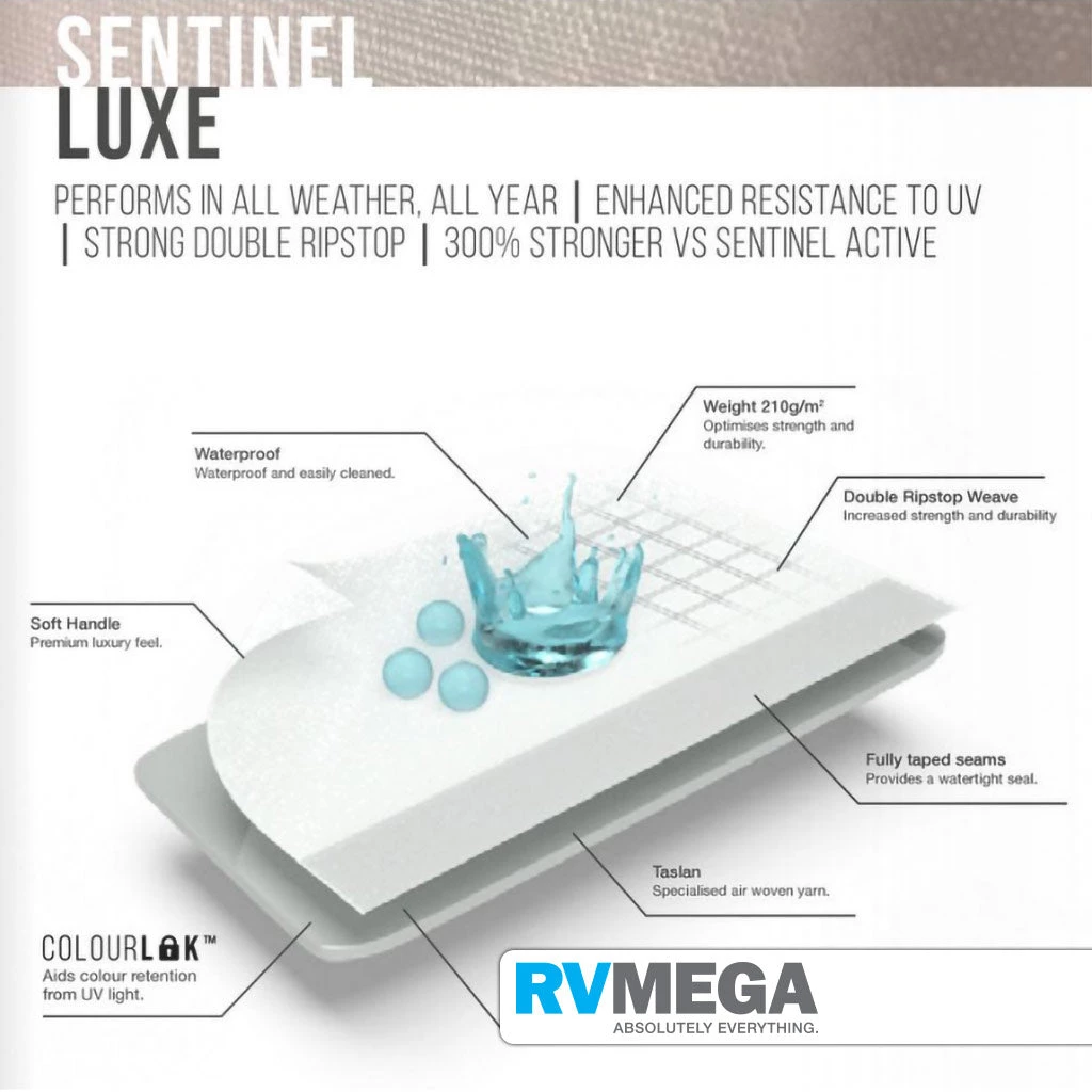 Sentinel Luxe – Taslan fabric which is fully wind and waterproof due to the construction of each yarn and the process by which the fabric is woven. Sentinel Luxe also features our double weave ripstop and is dyed using our new ColourLok™ technology for UV resistance, ensuring confidence no matter what the weather throws at you.